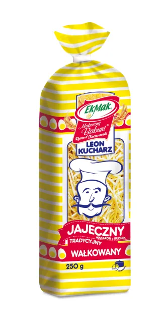 Leon Kucharz Krajanka to tradycyjny polski produkt, który przywołuje smaki dzieciństwa. Walcowany ręcznie, tak jak dawniej robiły to nasze mamy i babcie, z dbałością o każdy detal. Wyprodukowany ze starannie dobranych mąk oraz świeżych, wiejskich jaj, które nadają mu wyjątkową teksturę i niepowtarzalny smak. Dzięki tradycyjnym metodom produkcji, makaron Leon Kucharz Krajanka zachowuje wszystkie wartości odżywcze i naturalne walory smakowe. Poczuj różnicę i ciesz się prawdziwym, polskim smakiem w każdym kęsie.