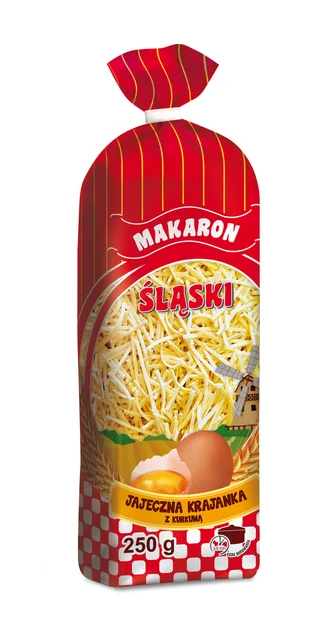 Makaron Śląski to tradycyjny polski produkt, który przywołuje smaki dzieciństwa. Walcowany, tak jak dawniej robiły to nasze mamy i babcie, z dbałością o każdy detal. Wyprodukowany ze starannie dobranych mąk oraz świeżych, wiejskich jaj, które nadają mu wyjątkową teksturę i niepowtarzalny smak. Dzięki tradycyjnym metodom produkcji, makaron Makaron Śląski zachowuje wszystkie wartości odżywcze i naturalne walory smakowe. Poczuj różnicę i ciesz się prawdziwym, polskim smakiem w każdym kęsie.