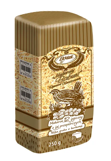 Przepiórczy Nitka Gruba to wyjątkowy makaron, który zachwyca delikatnym smakiem oraz unikalną teksturą. Produkujemy go z wysokiej jakości mąki i świeżych jaj przepiórczych, co gwarantuje niepowtarzalny smak każdego przyrządzonego z jego udziału dania.