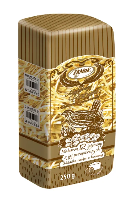 Przepiórczy Wstążka Cienka to wyjątkowy makaron, który zachwyca delikatnym smakiem oraz unikalną teksturą. Produkujemy go z wysokiej jakości mąkiświeżych jaj przepiórczych, co gwarantuje niepowtarzalny smak każdego przyrządzonego z jego udziału dania.