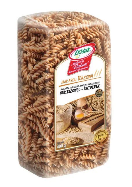 Świderek Orkisz zachwyca delikatnym smakiem oraz unikalną teksturą. To wyjątkowy makaron walcowany jak dawniej, nawiązujący do tradycji przekazywanej przez nasze mamy i babcie. Wyprodukowany z wysokiej jakości mąki i czterech świeżych jajek, gwarantuje niepowtarzalny smak każdego dania. Ten makaron wyróżnia się niepowtarzalnym układem, gdzie nitki są długie i starannie zwijane, tworząc charakterystyczny wzór.