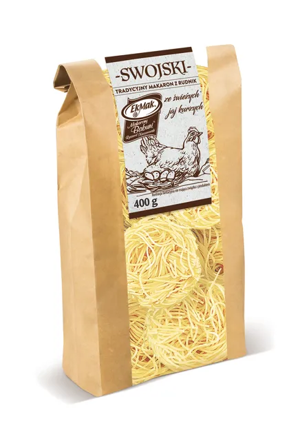 Swojski Tradycyjny Gniazdo Nitka zachwyca delikatnym smakiem oraz unikalną teksturą. To wyjątkowy makaron walcowany jak dawniej, nawiązujący do tradycji przekazywanej przez nasze mamy i babcie. Wyprodukowany z wysokiej jakości mąki i czterech świeżych jajek, gwarantuje niepowtarzalny smak każdego dania. Ten makaron wyróżnia się niepowtarzalnym układem, gdzie nitki są długie i starannie zwijane, tworząc charakterystyczny wzór.