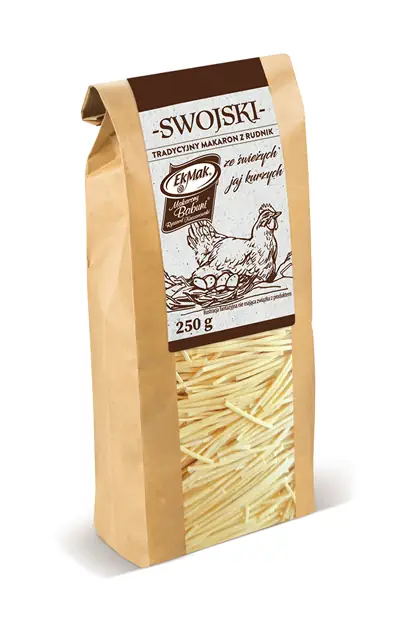 Swojski Tradycyjny Krajanka zachwyca delikatnym smakiem oraz unikalną teksturą. To wyjątkowy makaron walcowany jak dawniej, nawiązujący do tradycji przekazywanej przez nasze mamy i babcie. Wyprodukowany z wysokiej jakości mąki i czterech świeżych jajek, gwarantuje niepowtarzalny smak każdego dania. Ten makaron wyróżnia się niepowtarzalnym układem, gdzie nitki są długie i starannie zwijane, tworząc charakterystyczny wzór.