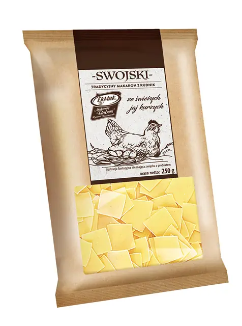 Swojski Tradycyjny Łazanka zachwyca delikatnym smakiem oraz unikalną teksturą. To wyjątkowy makaron walcowany jak dawniej, nawiązujący do tradycji przekazywanej przez nasze mamy i babcie. Wyprodukowany z wysokiej jakości mąki i czterech świeżych jajek, gwarantuje niepowtarzalny smak każdego dania. Ten makaron wyróżnia się niepowtarzalnym układem, gdzie nitki są długie i starannie zwijane, tworząc charakterystyczny wzór.