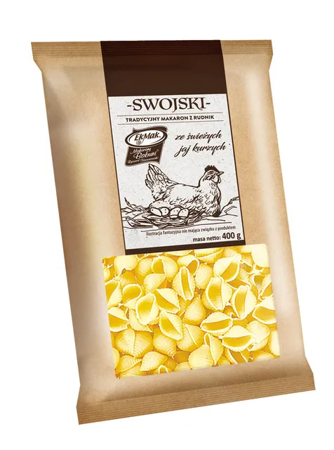 Swojski Tradycyjny Muszelka zachwyca delikatnym smakiem oraz unikalną teksturą. To wyjątkowy makaron walcowany jak dawniej, nawiązujący do tradycji przekazywanej przez nasze mamy i babcie. Wyprodukowany z wysokiej jakości mąki i czterech świeżych jajek, gwarantuje niepowtarzalny smak każdego dania. Ten makaron wyróżnia się niepowtarzalnym układem, gdzie nitki są długie i starannie zwijane, tworząc charakterystyczny wzór.