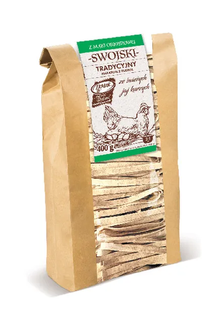 Swojski Tradycyjny Orkiszowy Wstążka zachwyca delikatnym smakiem oraz unikalną teksturą. To wyjątkowy makaron walcowany jak dawniej, nawiązujący do tradycji przekazywanej przez nasze mamy i babcie. Wyprodukowany z wysokiej jakości mąki i czterech świeżych jajek, gwarantuje niepowtarzalny smak każdego dania. Ten makaron wyróżnia się niepowtarzalnym układem, gdzie nitki są długie i starannie zwijane, tworząc charakterystyczny wzór.