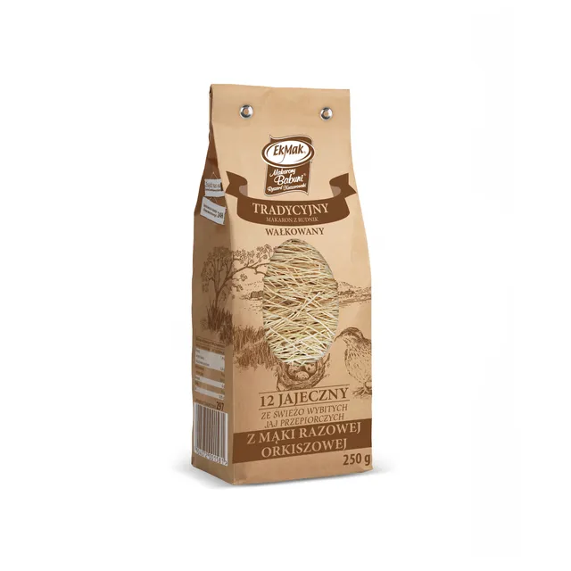 Makaron Przepiórczy z mąki orkiszowej produkowany jest w tradycyjnej rodzinnej manufakturze z dbałością o najwyższą jakość składników. Ten wyjątkowy makaron walcowany jak dawniej, nawiązuje do tradycji przekazywanej przez nasze mamybabcie.